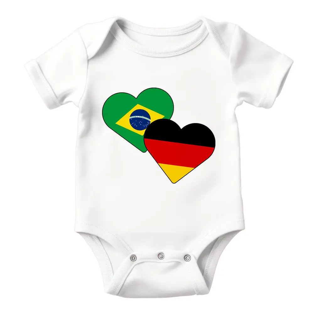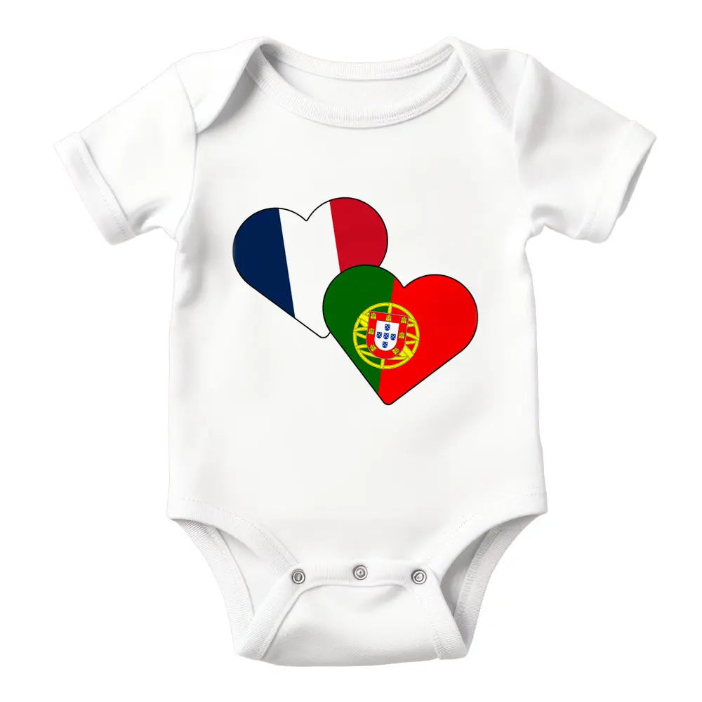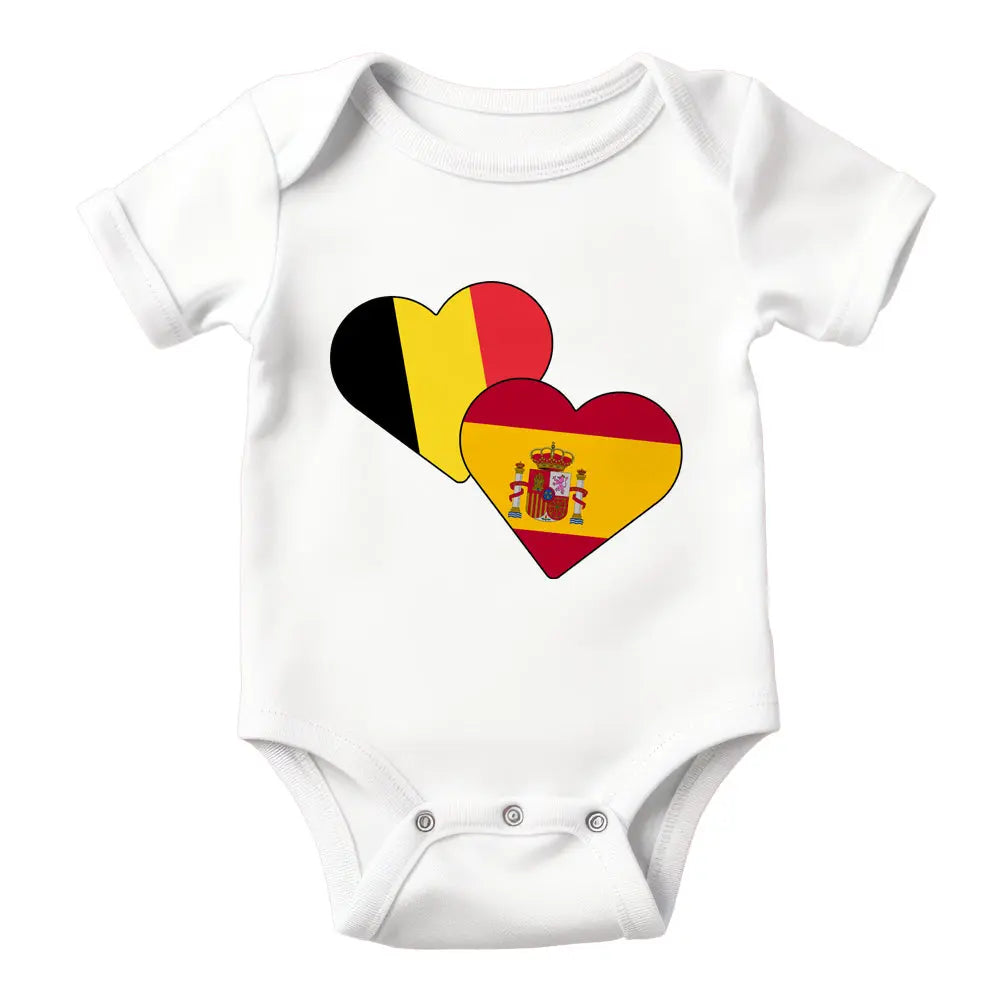 Ce body bébé personnalisé adorable arbore un design unique avec deux cœurs représentant les drapeaux de vos pays de naissance ou de coeur, symbolisant parfaitement l'héritage biculturel. Confectionné en coton doux et confortable, il est idéal pour la peau délicate de bébé. Le col rond et les manches courtes offrent une liberté de mouvement optimale, tandis que les boutons-pression facilitent l'habillage. La coupe classique s'adapte parfaitement aux mouvements de bébé. Le tissu blanc met en valeur les drapeaux colorés, créant un vêtement à la fois élégant et significatif. C'est un cadeau parfait pour toutes les familles ou pour célébrer deux magnifiques cultures. Disponible en plusieurs tailles pour accompagner la croissance de bébé.