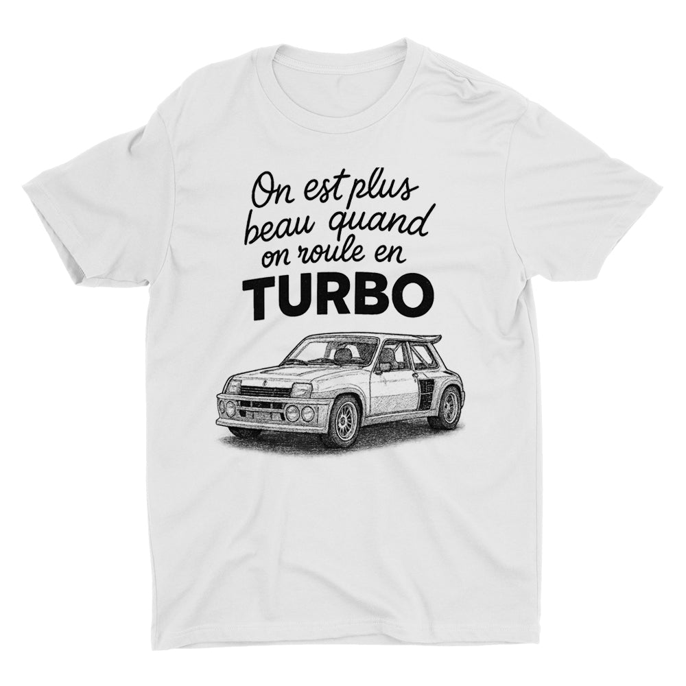 T-Shirt On est plus beau quand on roule en R5 turbo, humour homme, 100% coton, blanc