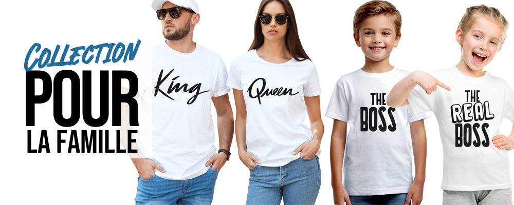 T-shirts famille personnalisés & assortis : modèles pour papa, maman et enfants. Idée cadeau pour Noël, anniversaires & Fête des Pères/Mères. Qualité premium, livraison rapide.