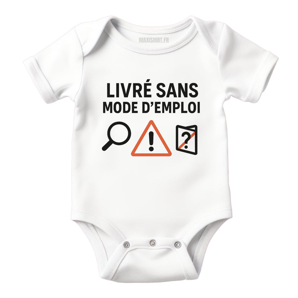 Body bébé humour 'Livré sans mode d'emploi', Vêtement Blanc nouveau né – MAXI SHIRT