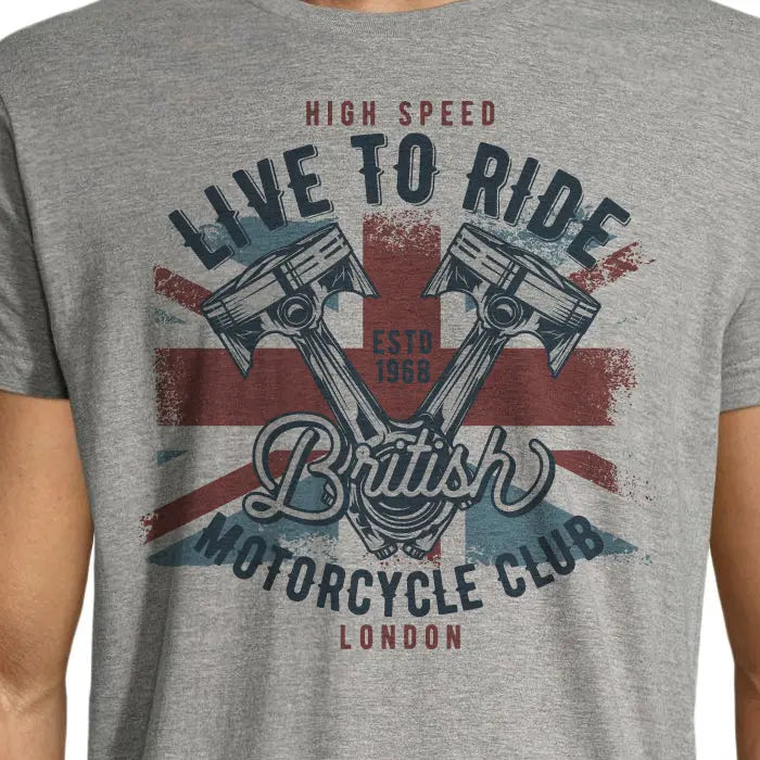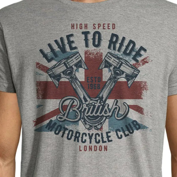 Adoptez un style british avec ce t-shirt gris chiné pour homme qui affiche fièrement la devise "Live to Ride". Les manches courtes et le motif biker font de ce t-shirt un choix idéal pour les fans de motos anglaises. Offrez-le en cadeau à un motard pour lui montrer votre soutien dans sa passion.