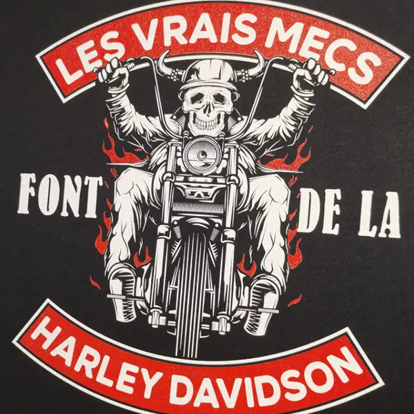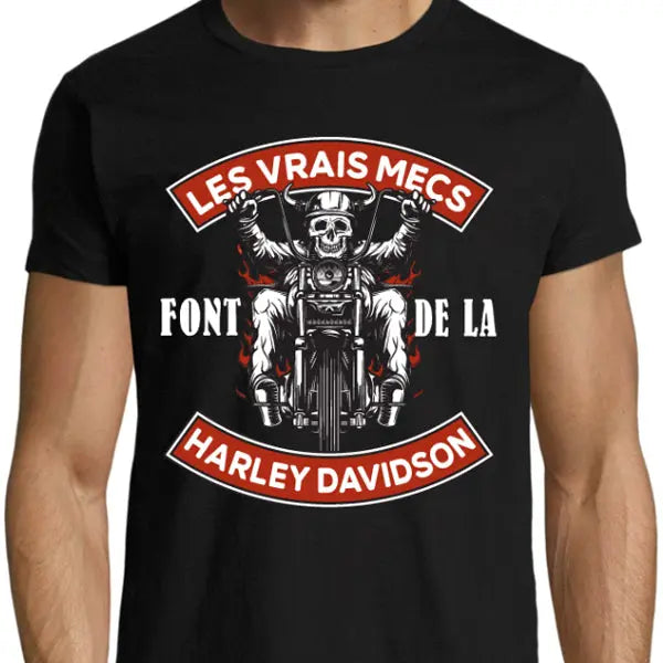 Ce t-shirt motard drôle fabriqué en 100% coton avec son message : Les vrais mecs font de la Harley Davidson pourrait bien être votre prochaine idée cadeau pour votre motard préféré ! Coupe régulière, tissu épais, notre t-shirt motard drôle est confortable et résistant pour faire face à toutes les situations du quotidien, mais surtout pour vous accompagner dans vos balades à moto. Optez pour un look biker avec ce t-shirt motard drôle imprimé dans notre atelier français.