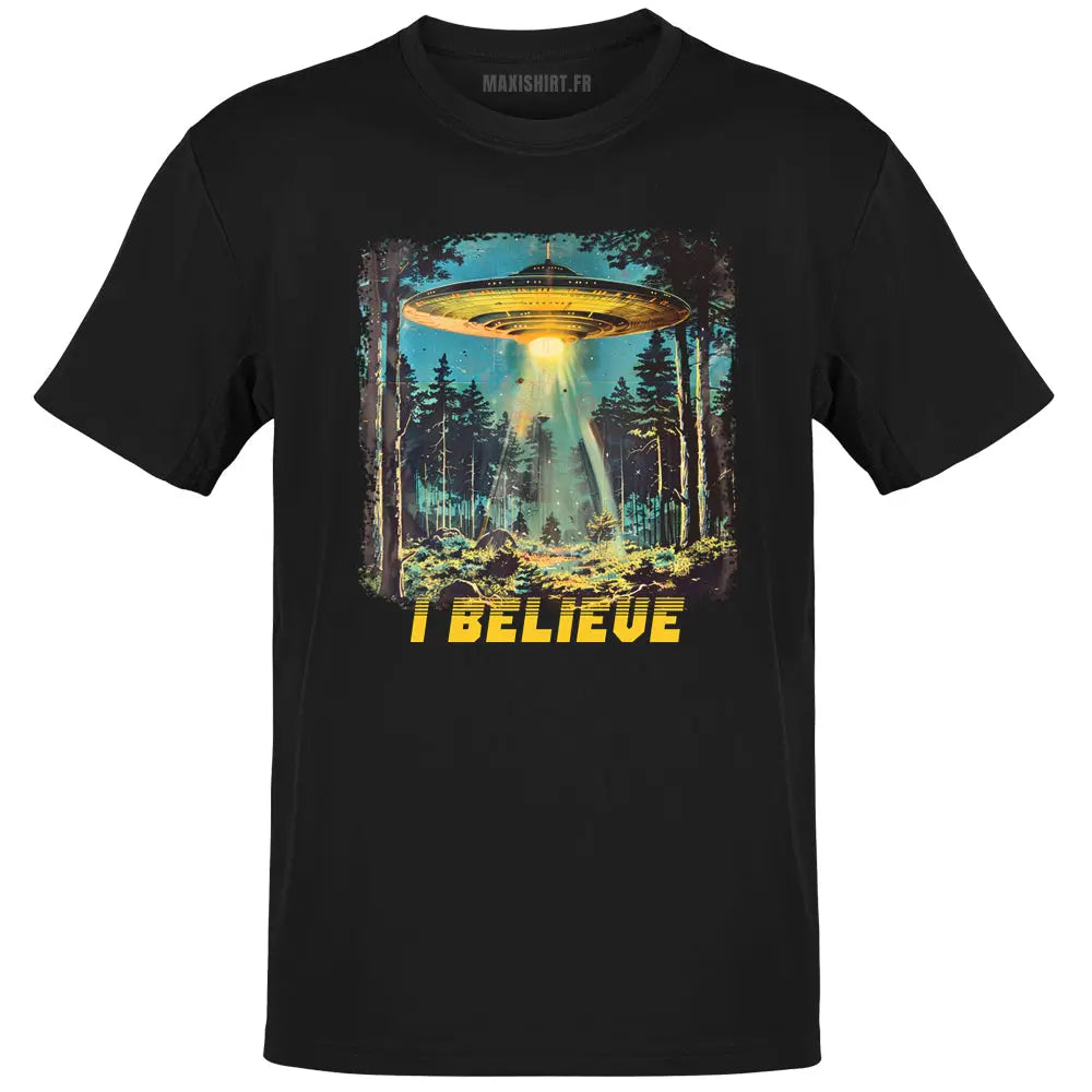 "I Believe" - Pour ceux qui croient en l'existence des extraterrestres et des soucoupes volantes, ce t-shirt noir unisexe est pour vous ! Conçu avec 100% de coton de qualité supérieure, ce t-shirt vintage fera un cadeau original et amusant pour tout passionné de l'espace. (Soucoupe volante et aliens non inclus)